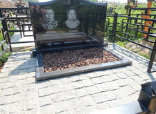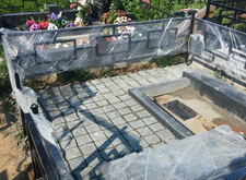 Далее мы привозим гранит для подставки под памятник, балки цветника и брусчатку. Для того, чтобы брусчатка не разваливалась в последствии по бокам, мы обвариваем периметр под оградой металлической полосой. После установки гранита и брусчатки могила выглядит следующим образом.