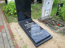 На него установили цветник и подставку для памятника. Борта цветника накрыли стоявшей ранее на участке гранитной доской, предварительно её отполировав и добавив гравировки. Получившаяся надгробная плита выглядит довольно-таки презентабельно.