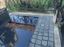 Мы уже занимались работами на этой могиле в прошлом году. Мы наносили гравировку портрета и сделали надпись. В этот раз мы сначала уложили брусчатку и надгробные плиты. Через несколько недель покрасили ограду, сделали покраску дешевле, как уже постоянному клиенту. Вот что нас встретило при первом посещении могилы, дело было весной. Работу начали через три недели.