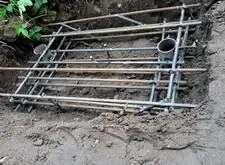 Далее мы приступили к изготовлению надёжного каркаса для массивной гранитной плиты. Взяв привезённые заранее сваи, мы вырыли относительно глубокую яму, и забили металлические трубы с двух сторон по её краям. Они и послужат двумя главными опорными точками для металлического каркаса, который мы тут же сварили из арматуры.