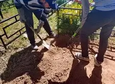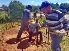 На каждом из четырёх углов вкручиваем сваи. Грунт на данной могиле попался твёрдый, после того, как сваи уже не вкручиваются, начинаем их забивать. Окончательно загнать сваи в землю так и не удалось, поэтому срезаем выступающие части. На качестве каркаса данное решение никак не отобразилось, так как длинна наших свай всегда несколько больше, чем требуется.