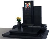 Строгий мемориальный комплекс из черного гранита генерал-майора МВД РФ на Троекуровском кладбище